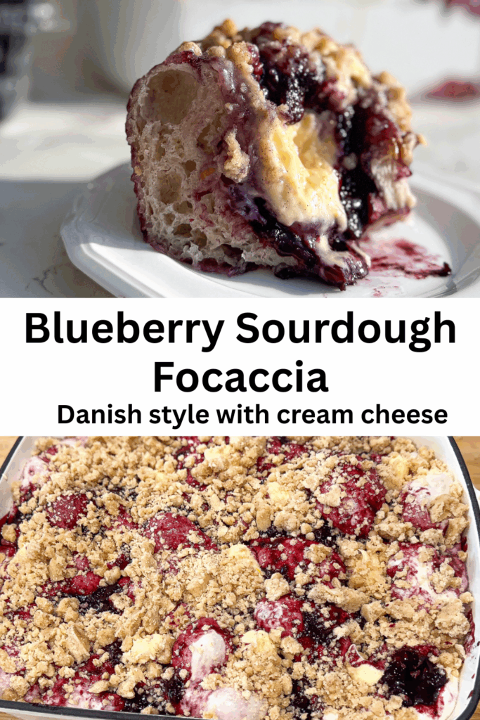 This recipe is the perfect marriage between simple sourdough focaccia bread and the sweet, jammy flavors of a Danish pastry. Imagine pillowy focaccia dough with an airy crumb, lightly sweetened with honey, folded around a juicy blueberry compote, and topped with pockets of creamy cheesecake filling. Once baked, it comes out golden brown, glossy, and irresistible. It’s part rustic Italian bread, part bakery-style dessert, and completely addicting.