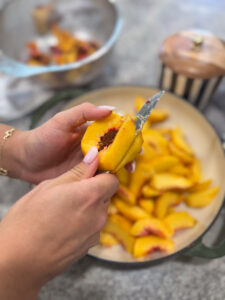 - If using fresh fruit, peel (or leave the peach skin on) and slice into 1/2″ wedges on a cutting board. (throw away the pit)