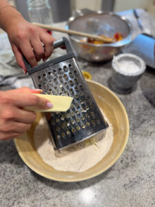 - Use a pastry cutter or food grater to cut the stick of cold butter into the flour until the mixture resembles coarse crumbs.