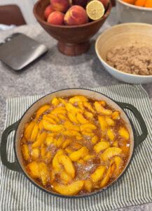 - Melt butter from half a stick of butter over medium heat and pour the melted butter over the peach mixture.