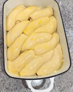 Roll the dough into a log, similar to cinnamon buns, but don’t pinch the seam closed. Place seam-side down into a buttered baking pan, loaf pan, rectangular pan, or bundt pan.