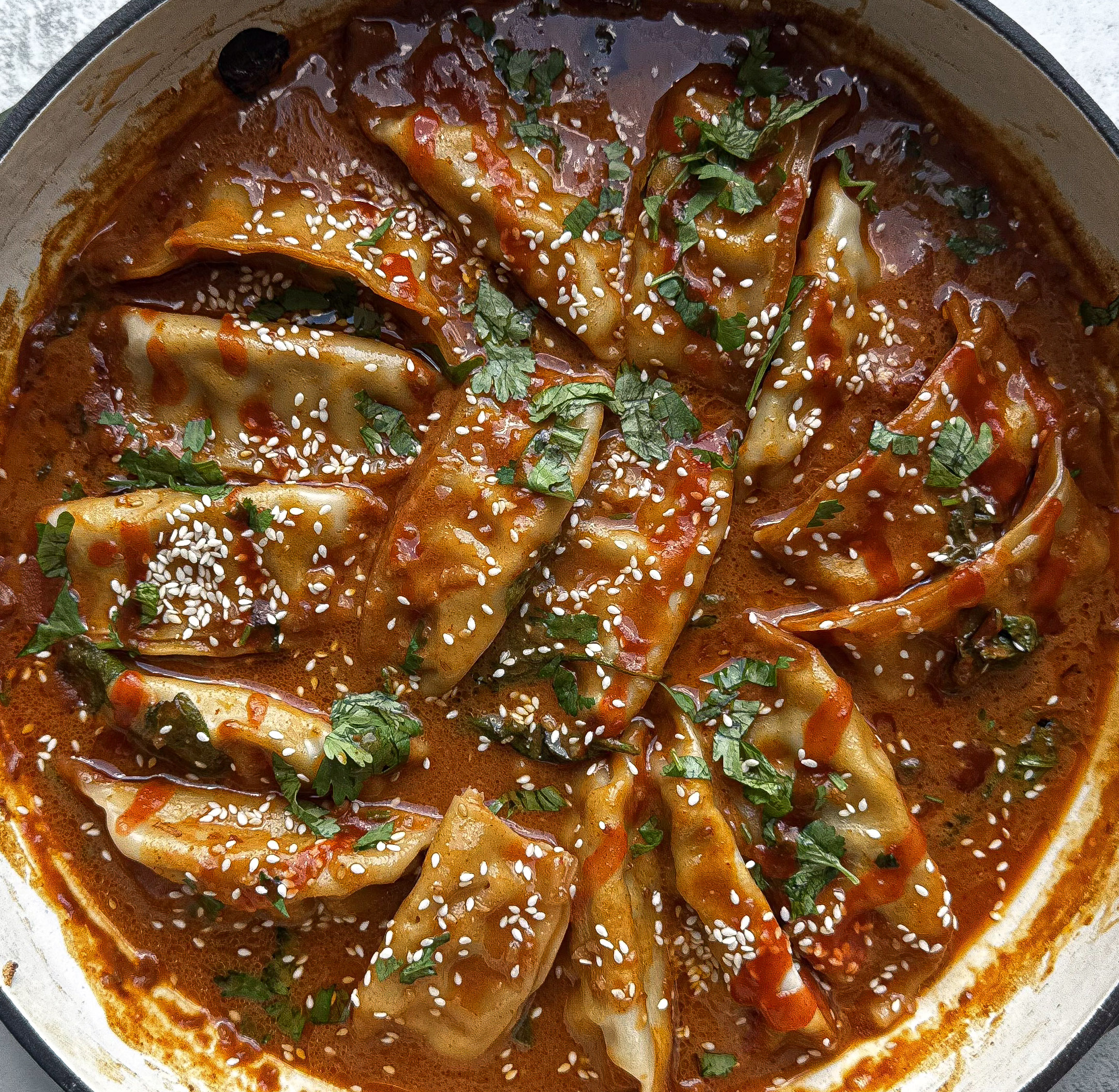 I tested this one a few times, tweaking the sauce and toppings until I found the right balance of richness, spice, and fresh crunch. Think of it like a cross between a dumpling soup, a casserole, and the kind of comfort food you’ll reach for when you need an easy weeknight meal.
